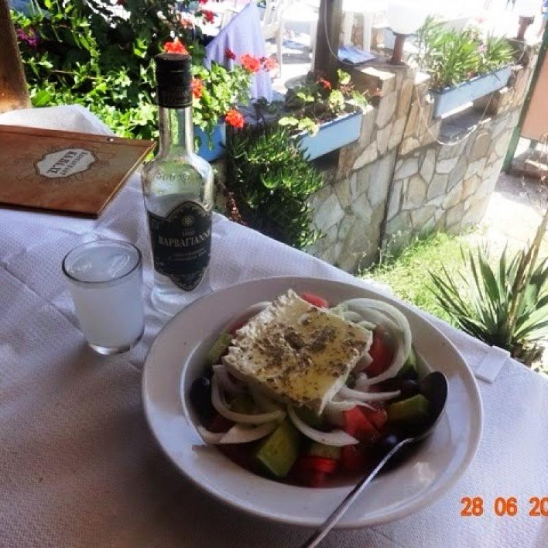 Öncelikle acıkan karınlar Kapaki Taverna'da souvlaki (şiş), sucukaki (köfte), ev yapımı sosis ve de olmazsa olmazımız Grek salatanın suyuna bana bana doyurulup sonra denize atlanıyor. Yunan Adaları’nın en sevdiğim yanı bu… Restoran ve deniz iç içe… Denize gir-çık, güneşlen, ye-iç, hepsi bir arada ve de gayet mantıklı rakamlara (hesap 52 €).