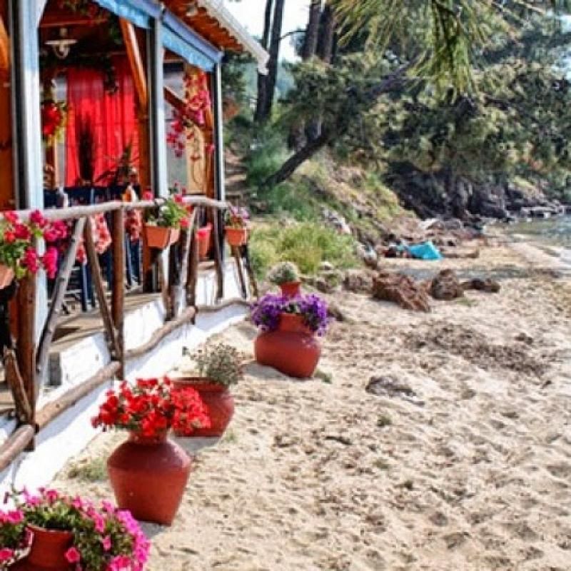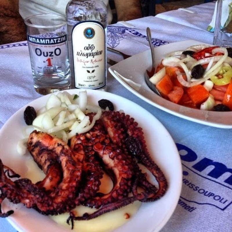 Denize gir-çık, gir-çık karınlar acıkıyor. Etrafta restorandan ziyade plaj barı tadında şirin 3-5 mekân var ama bizim aklımız ahtapotta, kalamarda : ) Henüz, Thassos Adası'nda yiyeceğimiz en lezzetli deniz ürünlerinin az sonra damaklarımızı şenlendireceğinin farkında değiliz. Kumsalın sol ucunda deniz ile iç içe Taverna Pefkospilia'da lokum kıvamındaki ahtapotları, çıtır çıtır kalamarları, kızarmış kabakları mest modunda hüpletiyoruz.