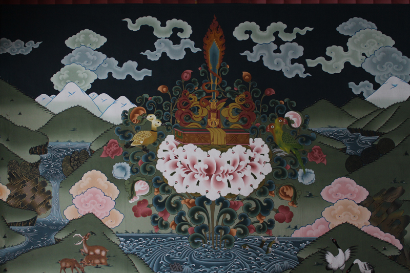 Girişte bizi büyük duvar resimleri karşılıyor. Bu resimlerde Budizm’le ilgili dini öğeler işlenmiş. Resimlerde özellikle lotus çiçeği figürü ön plana çıkıyor.