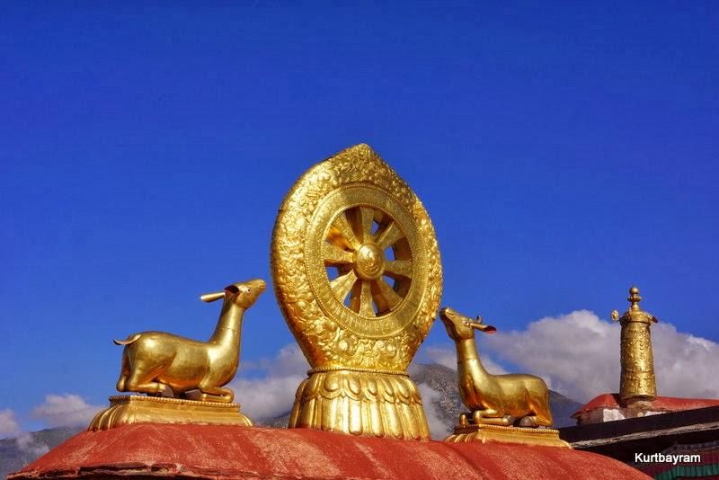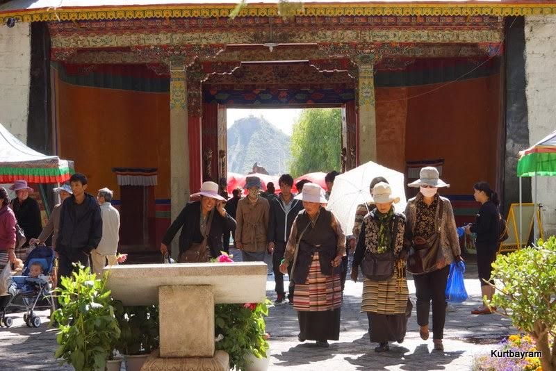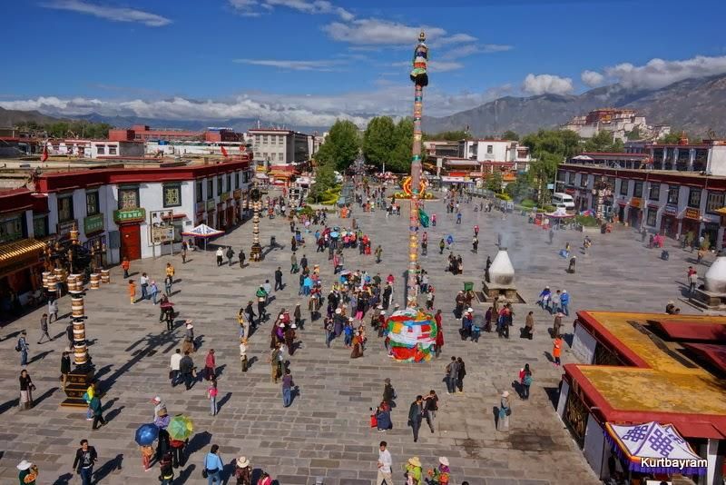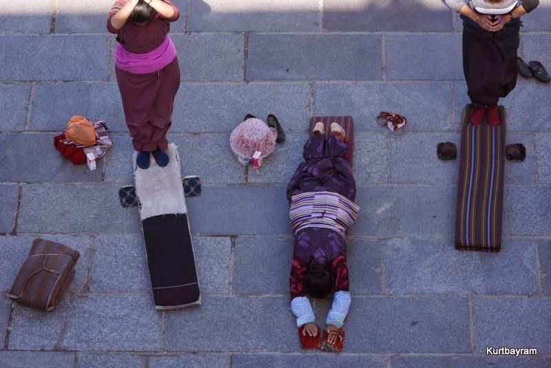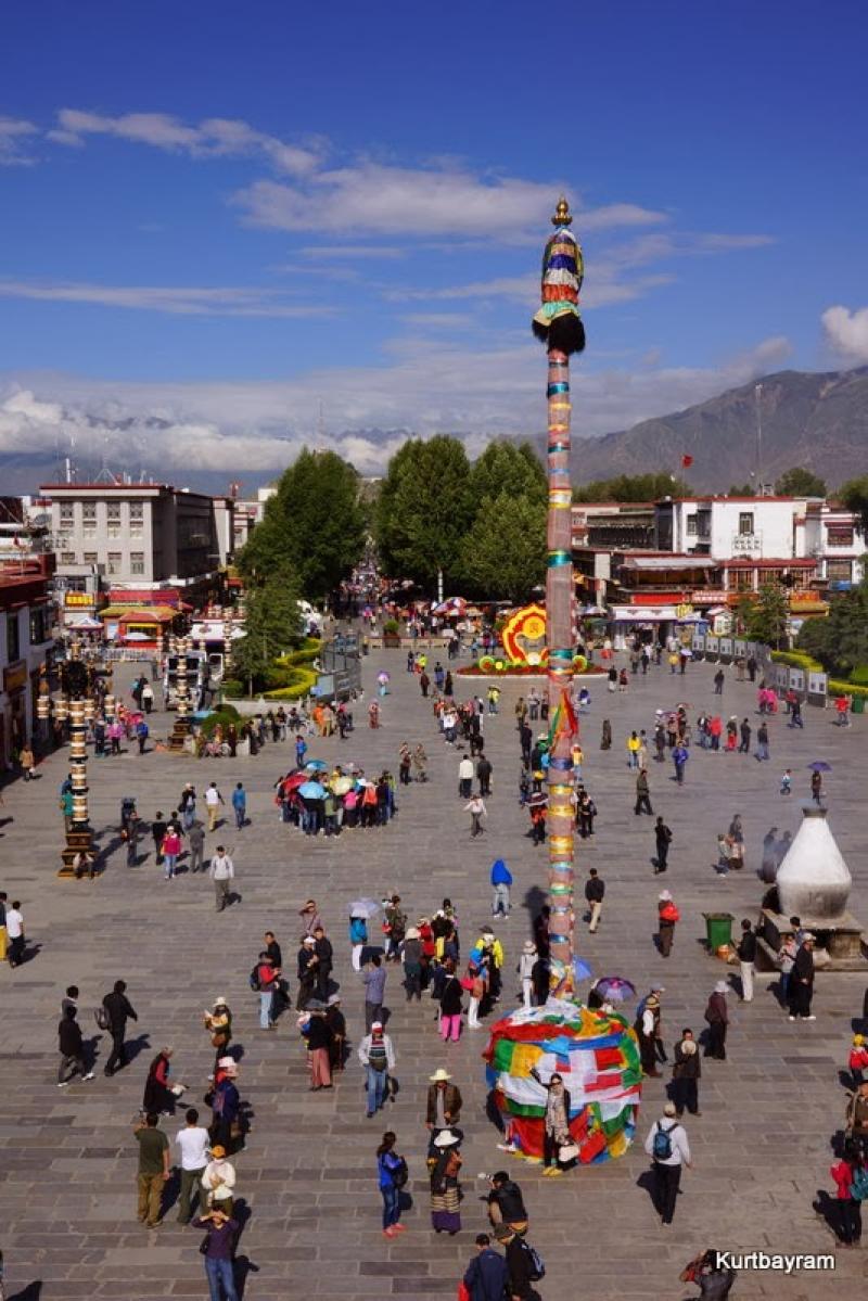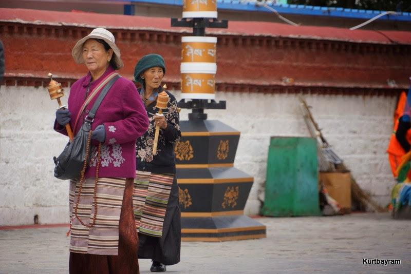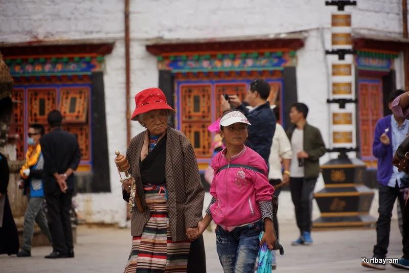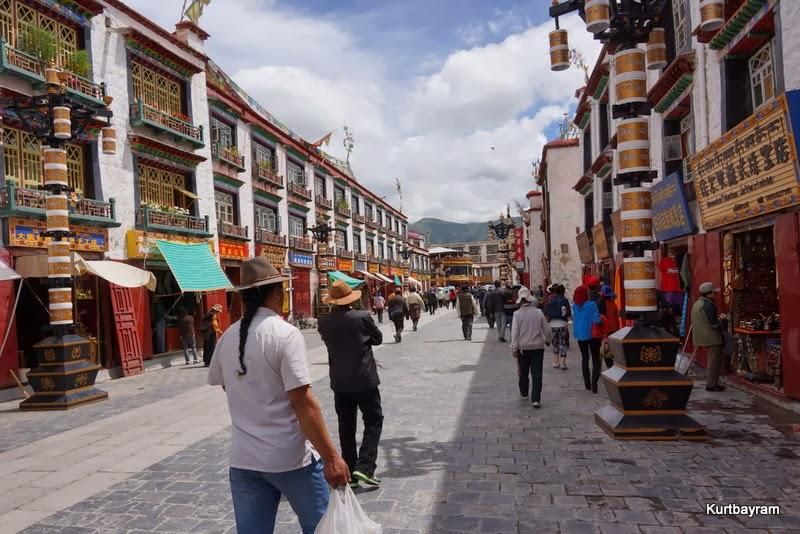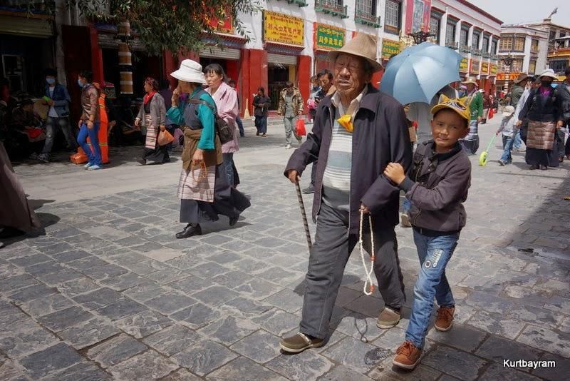 Her neyse daha güzel konulara dönelim, mesela eski şehir merkezi gibi… Lhasa'nın en hareketli yeri Barkhor Caddesi ve çevresi… Bu cadde çevresindeki tapınaklardan dolayı Tibetliler tarafından kutsal sayılıyor ve her an yüzlerce hacı sizinle birlikte turluyor. Dua etmek ve hacı olmak isteyen Tibetliler, yukarıdaki yaşlı teyze gibi sağ ellerine “dua tekeri”ni alıp bir mantra mırıldanırken Jokhang Tapınağı çevresinde ve Barkhor Caddesi'nde turluyor. Kaç tur? Bazıları 10 bin, bazıları daha fazla tur yaparmış.