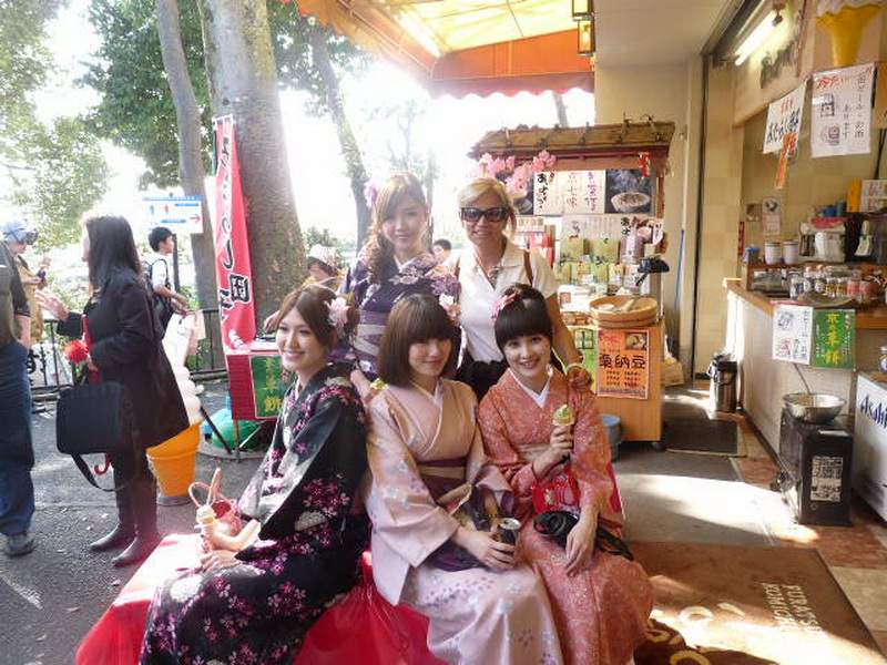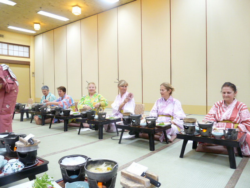 Odamızda banyo haricinde mini bir şifalı-su spa odası var, isteyen bu odayı isteyen otelin girişindeki Spa’yı kullanıyor. Akşam yemeğimiz tipik bir Japon-stili olacak. Otelin bir salonu bize ayrılmış ve sadece bizler için hazırlanmış sehpa masalar, yer minderleri, Japon porseleni tabaklar, kaseler ve tabii ki çatal-bıçak yerine çubuklar. Kimonolarımıza uyum sağlaması için çubukları topuzumun arasına geçirip bir Japon’a benzemeye çalışıyorum…