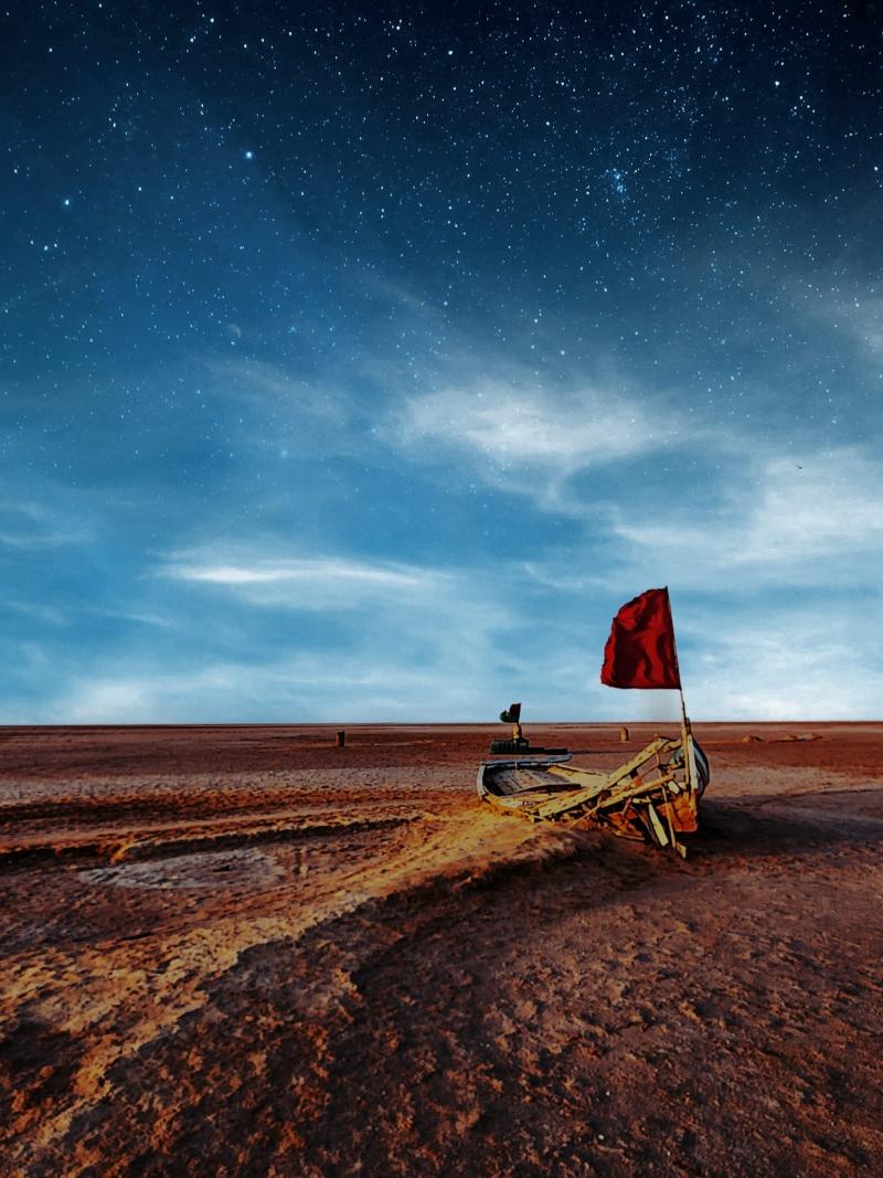 Daha gidecek çok yolumuz vardı, bu yüzden fazla oyalanmadan yola koyulduk. Biz asfalt yoldan gideceğimizi düşünüyorduk, çünkü diğer tüm tur araçları asfalt yoldan gidiyordu. Frekansımız Amir’le uyuşmuştu. Bize kestirme yoldan gideceğini söyledi, çok geçmeden kendimizi çölün ortasında bulduk. Amir hızını alamadı ve arabayla akrobatik hareketler yapmaya başladı, tepelere çıkıyor arabayı kum yığınları üzerinden yokuş aşağı serbest bırakıyordu, tabii biz alışık olmadığımız için en başta korktuk ama gezinin en heyecanlı bölümü burasıydı. Yolun ortasında durdu ve “Sol taraf Ong Jmal, fotoğraf çekmeniz için size 8 dakika veriyorum.” dedi. Biz de aceleyle çekebildiğimiz kadar fotoğraf çekmeye çalıştıkbasladik. Burası hakkında kısaca bilgi vermek gerekirse, adı "Deve Kamburu" anlamına gelir ve burada bulunan büyük kaya oluşumlarından gelir. Ong Jmal, Star Wars filmlerinin bazı sahnelerinin çekildiği yer olarak da ünlüdür. Burada Luke Skywalker'ın evi ve Mos Espa şehri gibi mekanları görebilirsiniz. Ong Jmal, zaman ve mekandan kopuk bir turistik bölgedir. Resepsiyonist tembihlemiş olacak ki Amir 1 dakika bile boşa geçirmek istemiyordu. Hemen tekrar yola koyulduk, bir süre sonra “Aaaa bakın ileride su var.” dedi. Gerçekten uçsuz bucaksız göl görünüyordu. Daha sonra çocukken okuduğum hikaye kitapları gözümün önüne geldi: Çölleri develerle aşmaya çalışan susuz kalmış bedeviler suya ulaştıklarını düşünerek koşuyorlardı, serap gördüklerini anlayınca da hayal kırıklığına uğruyorlardı. Çölde yaşamasak da bir şeyler biliyorduk.