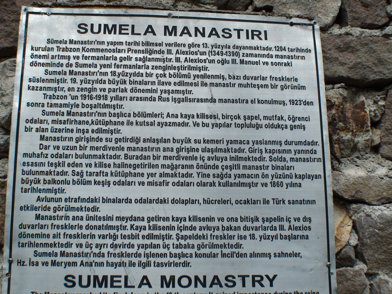 Sumela Manastırı’nın bir çok bölümü 18. yüzyılda yenilenmiş ve bazı duvarlar fresklerle süslenmiştir. Manastır dünyanın yaratılışını İsa’nın hayatını anlatan nefis fresklerle dolu. O dönemdeki en önemli iletişim resim olduğu için tüm duvarlar silme fresk. Ancak günümüzde fresklerin çok tahrip edilmiş olması içimizi burktu.