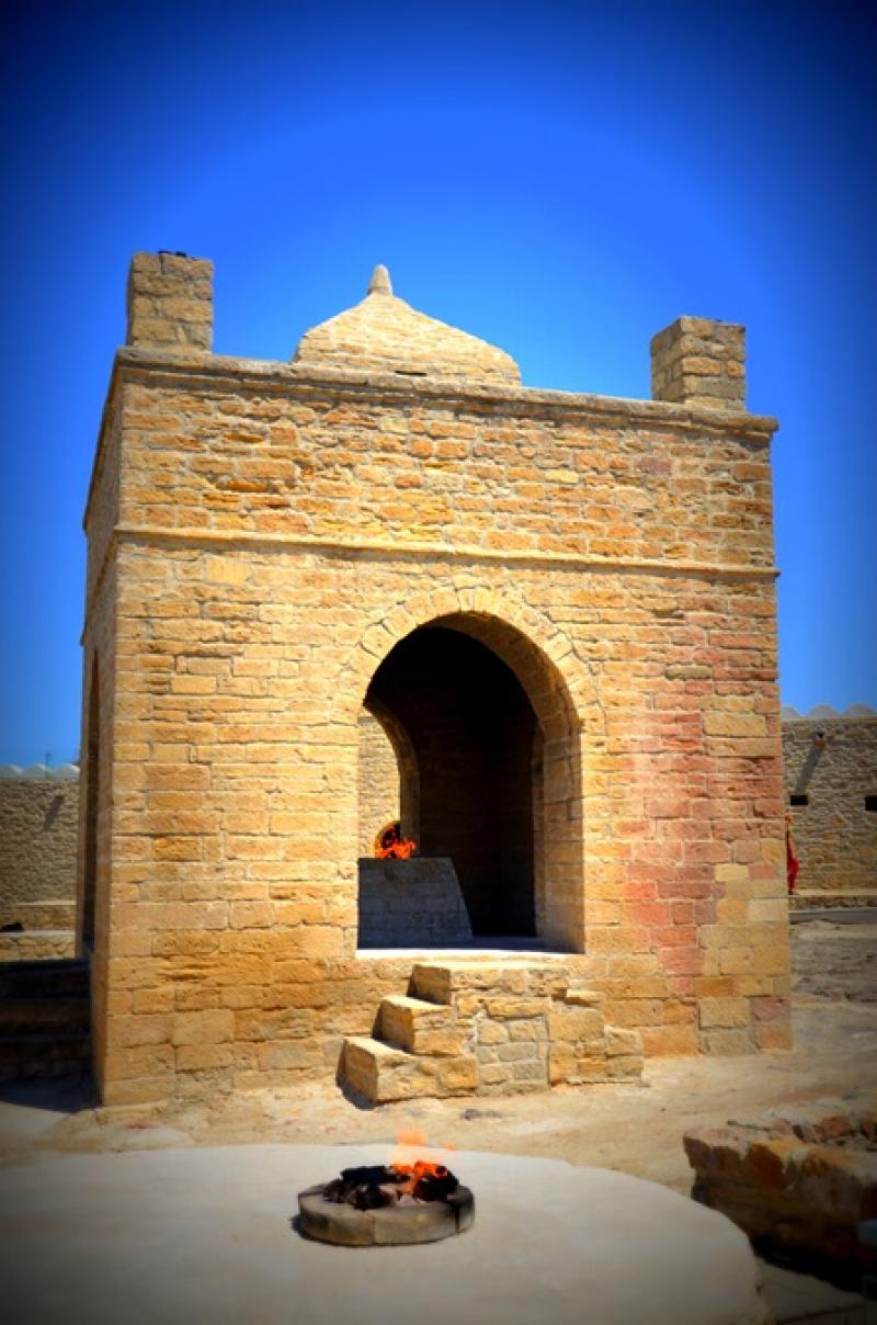 ‘Ateşgahlar Mabedi’nden söz açmadan olmaz! Zerdüşt amcalar, 14. yüzyıldan önce buraya yerleşip uzunca ibadet etmişler. Azerbaycan(Odlar Yurdu) isminin kökeninin buradan geldiğini söylüyorlar. Dünyadaki ilk Zerdüşt tapınağıymış. Sonra Hintliler burayı zapt edip, küçük tapınağı pencerelerinden görebilecek şekilde birbirine bitişik çilehaneler yapmışlar. Bu çilehanelerin içinde küçük bir kısımda ateş yakmak için ayrılmış olması insanı Zerdüştlerin samimiyetleri konusunda etkiliyor.