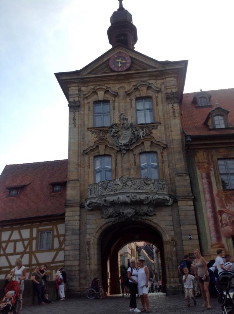 Belediye binasının üst kısmında, yani adacık tarafında çok güzel bir kule mevcut. Bu kulenin altına geniş bir kemer yapılmış. Karşıya geçiş bu şekilde sağlanıyor. Bu kuleye yapışık, altından Regnitz Nehri geçen ve doğru dürüst bir temeli olmayan sarı renkli “Rottmeisterhauschen” ise çok güzel ve ilginç görünüyor. Bina, yapı izni vermeyen belediyeye karşı protesto amaçlı yapılmış. Küçük adayı eski şehre bağlayan, yani Obere Köprüsü’nden sonraki ilk köprüye gidildiğinde çok güzel fotoğraflar çekilebiliyor.