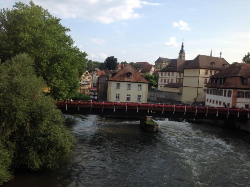 Regnitz Nehri ve Main-Danube Canal şehrin ortasından geçtiği için şehir üçe bölünmüş durumda. Regnitz Nehri ise “Eski Şehri” ikiye bölmüş. Bu nehir üzerinde yer alan eski belediye binasının hemen üstündeki kısımda nehrin akıntısına karşı baktığımızda, sol tarafta Alter Kanalı bulunmakta ve bu kanal yukarıda Regnitz’e tekrar birleştirilerek ortada küçücük bir ada oluşmuş. Bu ada kısmının alt ucuna yakın, yani Regniz Nehri’nin kanalla ikiye ayrıldığı kısımdaki köprü Obere (yukarı) Köprü ve 30-40 metre aşağısında ise ikinci bir köprü olan Untere (aşağı) Köprü bulunuyor.