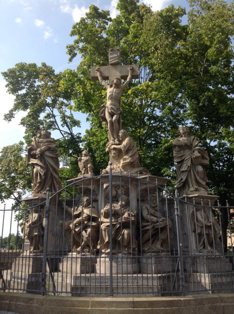 Grüner Meydanı’ndan yürüyüp Obere Köprüsü’ne girdiğimizde hemen karşımızda kule ve eski belediye binasını gördük. Köprünün hemen başında sağ tarafta başının üst kısmı olmayan metal levha ile yapılmış modern bir büst bulunmakta. Köprünün solunda ise 7-8 metre yükseklikte İsa’nın çarmıha gerilişi ve alt bölümde havarilerini betimleyen güzel heykeli de fotoğrafladıktan sonra, kulenin altındaki kemerden geçip karşı tarafa geldik.