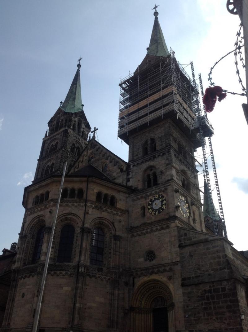 Dom (Bamberg) Katedrali’ni detaylı bir şekilde gezmeye başladık. Gezdiğimiz yerlerde Türkçe broşürlere alışık olmadığımızdan, katedraldeki Türkçe broşür bizi çok mutlu etti. Katedral 1012’de İmparator II. Heinrich tarafından yaptırılmış ve iki kez yangın geçirmiş. 1237’de kullanıma açılmış. İç mimarisi 17. yüzyılda Barok stiline göre düzenlenmiş. 1828-1837’de bu düzenleme yerini yeni Romanesk bir düzenlemeye bırakmış.