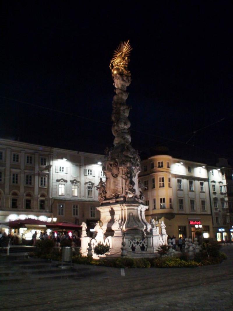Yemek sonrası hava karardı. Gece şehri dolaşmaya Landstrasse’den başladık. Şehrin kalbi sayılan Hauptplatz’a geldik. Meydanın ortasında 1723’teki veba salgınında ölenlerin anısına yapılmış Teslis Heykeli var. Çevrede pek çok kafe ve restoran bulunmakta.
