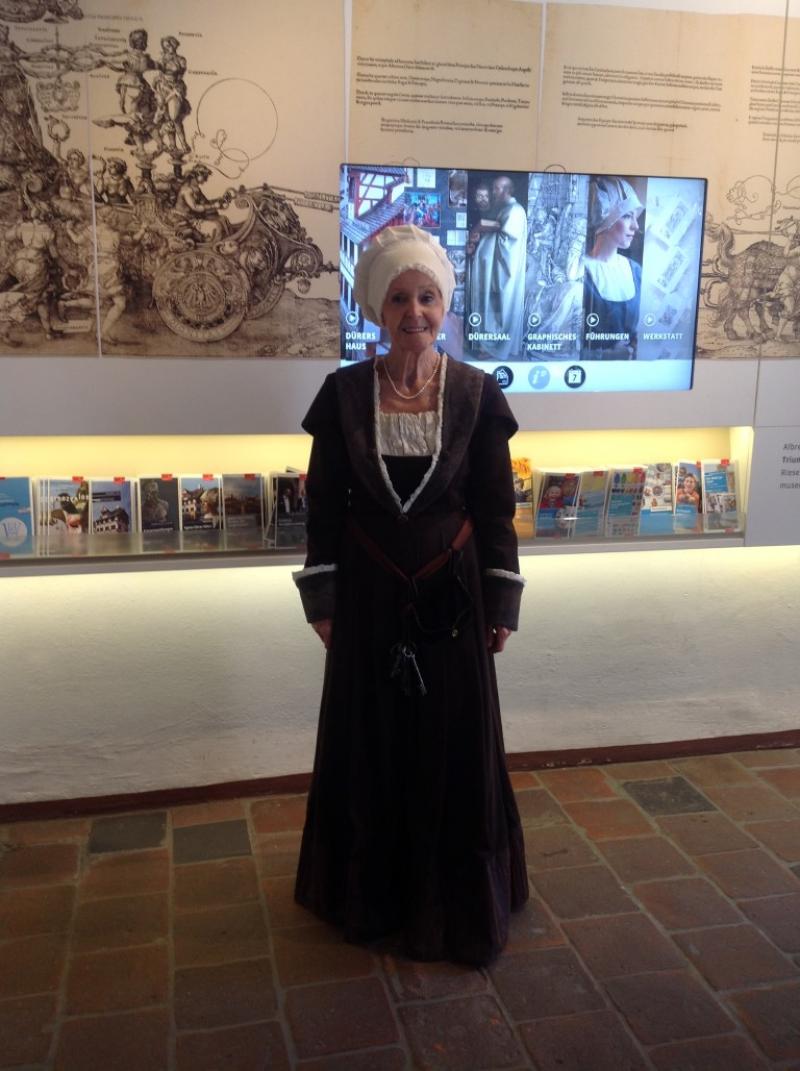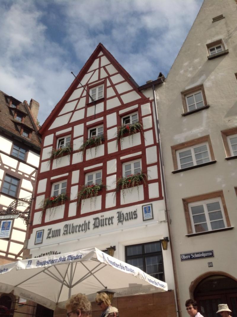 Surların bir kısmını gezerek kale etrafındaki eski su kanallarını fotoğrafladık. Kanallarda şu anda su yok. Kaleden inerek hemen kale surları yanındaki aynı adı taşıyan cadde üzerindeki Albrecht Dürer’in 1509-1528 yılları arasında yaşadığı eve geldik. Albrecht Dürer’in yaşadığı ev, müzeye dönüştürülmüş ve içinde sanatçının eserleri sergilenmekte. Müzede görev yapan kadınların Ortaçağ şıklığı ve zarafeti çok hoşumuza gitti.