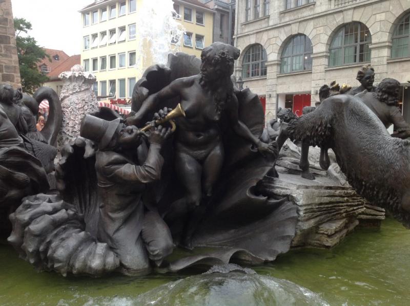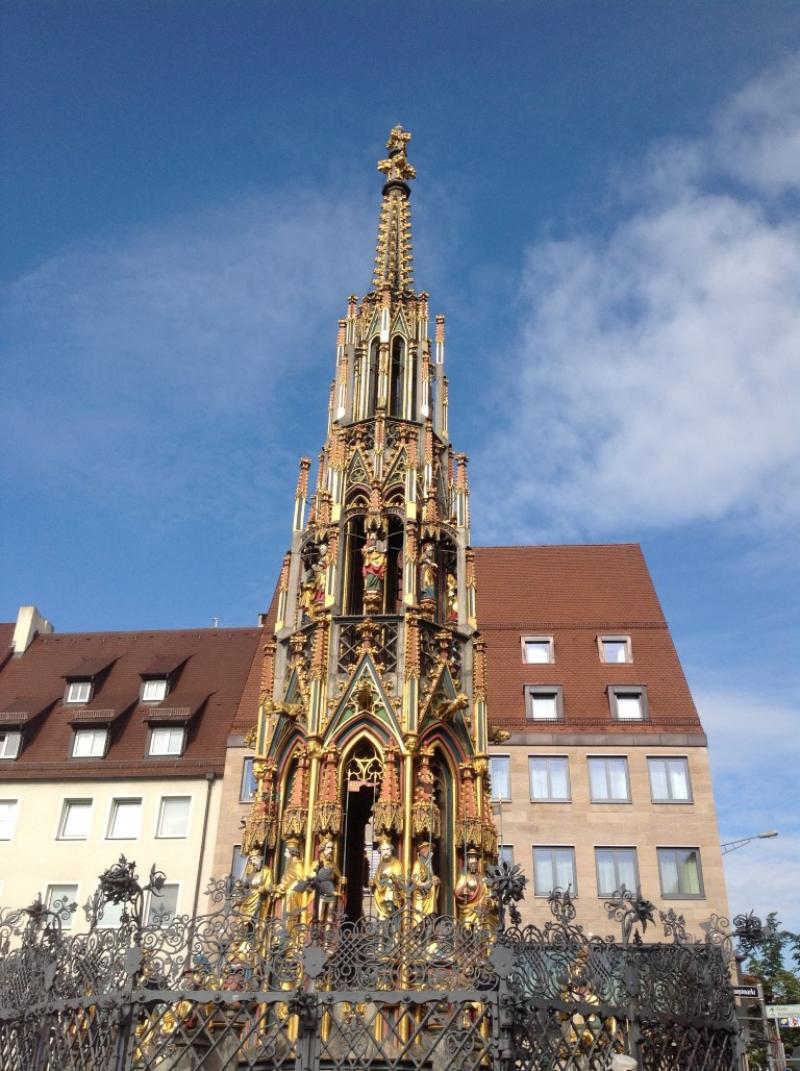 Tourist Information’dan gerekli bilgileri alıp Hauptmarkt’ta bulunan Frauenkirche (Bayanlar Kilisesi)’e geldik. Bu kilise 1352-1362 yılları arasında gotik tarzda yapılmış. Kilisenin ön yüzünde bulunan sanat saati Kunstuhr’da, Prag’taki saat gibi her gün saat tam 12.00’de saatin içinden çıkan 7 derebeyi figürü geçit töreni yapılıyormuş. Biz bu gösteriyi bekleyemedik, çünkü daha şehri gezmemiz gerek. Kilisenin içi oldukça sadeydi. Önündeki meydanda yer alan Schoner Brunnen (Beatiful Fountain) tüm ihtişamı ile meydanı süslüyor. 1385-1396 tarihlerinde gotik tarzda yapılmış olan bu renkli çeşme, bugüne kadar gördüğüm en güzel çeşmelerden biri.