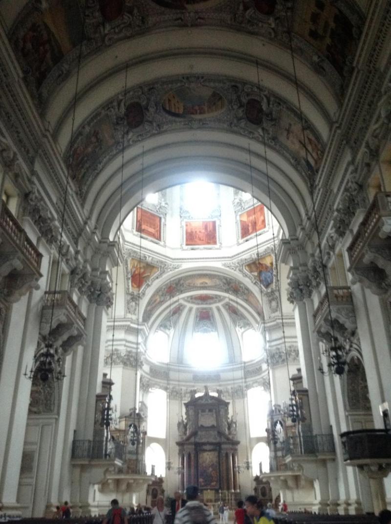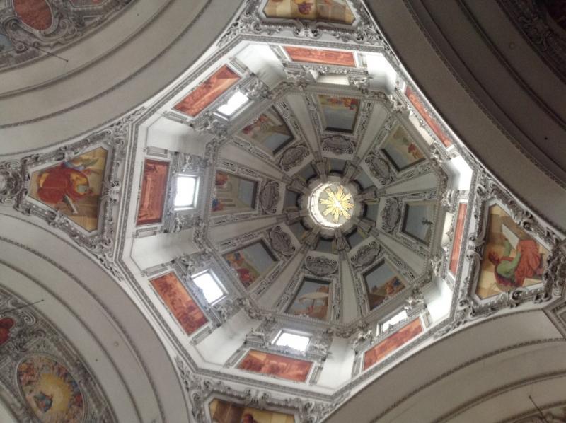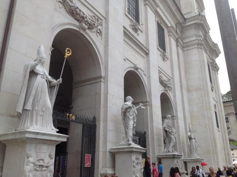 Salzburg Katedrali’nin önünde bir anıt var ve önü tamamen sandalyelerle dolu. Burası yazın 1 ayda en az 150 konsere ev sahipliği yapıyormuş. Bu şehir dar bir alana sıkıştığı için konserler için böyle meydanları kullanıyorlar. Katedralin önyüzünde 3 ayrı tarih var. En solda 774, ortada 1628 ve sağda 1959 tarihi yazıyor. Bu katedralin ilk yapım yılı 774, 1628’de barok tarzda genişletilmiş. 1959’da da savaş sonu tahrip olan kısım restore edilmiş. Barok tarzda yapılmış olan katedral, Aziz Rugert ve Aziz Vergilius’a adanmış.