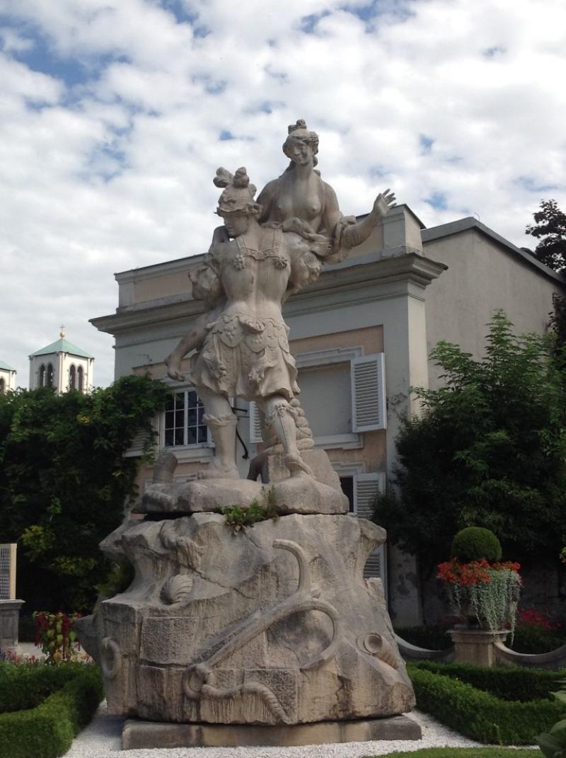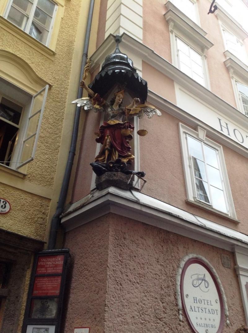Buluşma saatimiz çok yaklaştığı için Dom Meydanı’nın hemen yakınındaki Salzach Nehri’nin kenarında yer alan ve Mozart’ın heykelinin olduğu Mozart Meydanı’na gidemedik. Dar ara sokaklardan geçerken; bir evin köşesinde adaleti temsil eden gözleri kapalı, bir elinde terazi bir elinde kılıç olan ve ayağının altında şeytanı ezen adalet heykelini fotoğrafladık. Almanya ve Avusturya’da bu şekilde evlerin köşelerine yapılmış ve üstleri yağmurdan korunacak şekilde çatılandırılmış heykellere çok sık rastladık.
