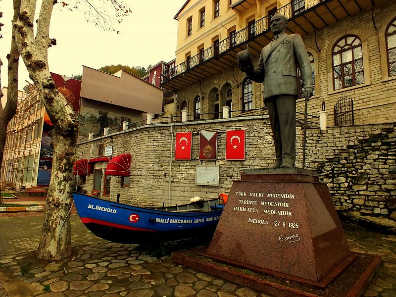 İnebolu’nun sembol yapısı; ilçenin tarihine hem tanıklık hem de misafirlik eden Türk Ocağı Binası. İlçe milli mücadele döneminde cepheye en yakın liman olduğundan İstanbul’dan ve yurt dışından gelen silah, mühimmat, erzak ve benzin ile savaşacak asker ve siviller burada toplanıyormuş. Kahraman kayıkçılar tarafından fotoğrafta gördüğünüz denk kayıklarına çıkartılan tüm bu malzeme, çocuklar ve kadınlar da dâhil tüm halk tarafından ya omuzlarda ya da kağnılarda patika yollardan Ankara’ya ulaştırılıyormuş. Nitekim İnebolu, 9 Haziran 1921 tarihinde Yunan zırhlılarının taarruzuna uğramış ancak halk direnmiş ve Yunanlıları püskürtmüş. İnebolu halkının yapmış olduğu bu gönüllü hizmet üç sene sürmüş ve karşılığında ne kayıkçılar ne hamallar ne de halk hiçbir ücret talep etmemiş. Bu nedenle de ilçeye 1924 yılında mücadeleye olan katkısına hürmeten İstiklâl Madalyası verilmiş. İşte tüm bu mücadelenin fotoğraflarını, milli mücadelenin amillerinden denk kayıklarını, en önemlisi de ilçeye verilen İstiklâl Madalyası’nın kendisini (sadece özel günlerde çıkarılıyor) Türk Ocağı’nda görmek ve fotoğraflamak mümkün.