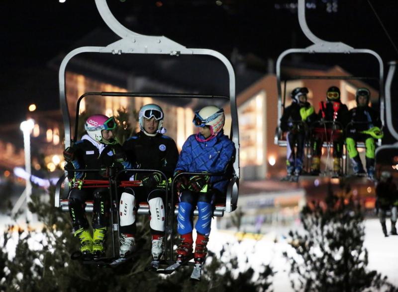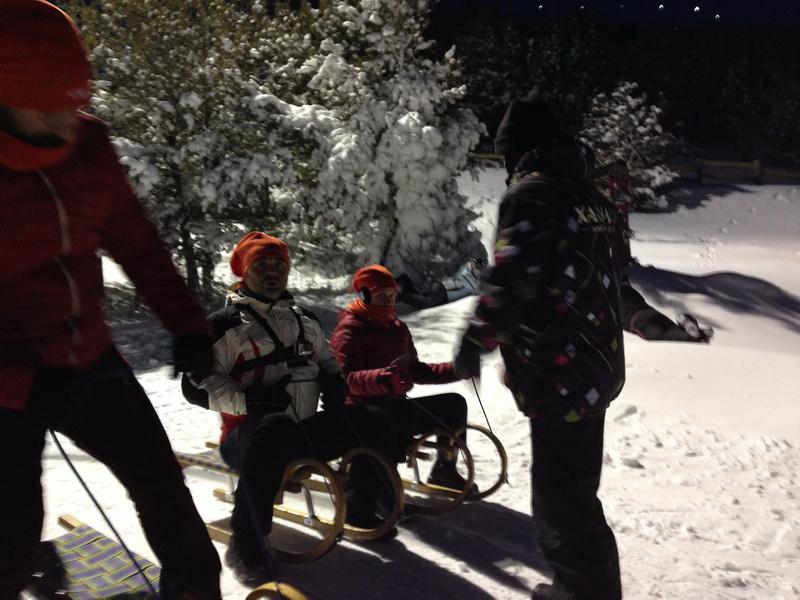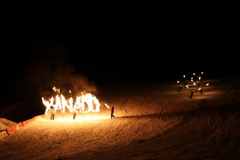 Kızak maceramız sonrasında Apreski bölümünde bize özel hazırlanan masaya yerleştik. Bir taraftan yemek yedik. Bir taraftan kayak hocalarının meşalelerle yaptığı gösteriyi izledik.