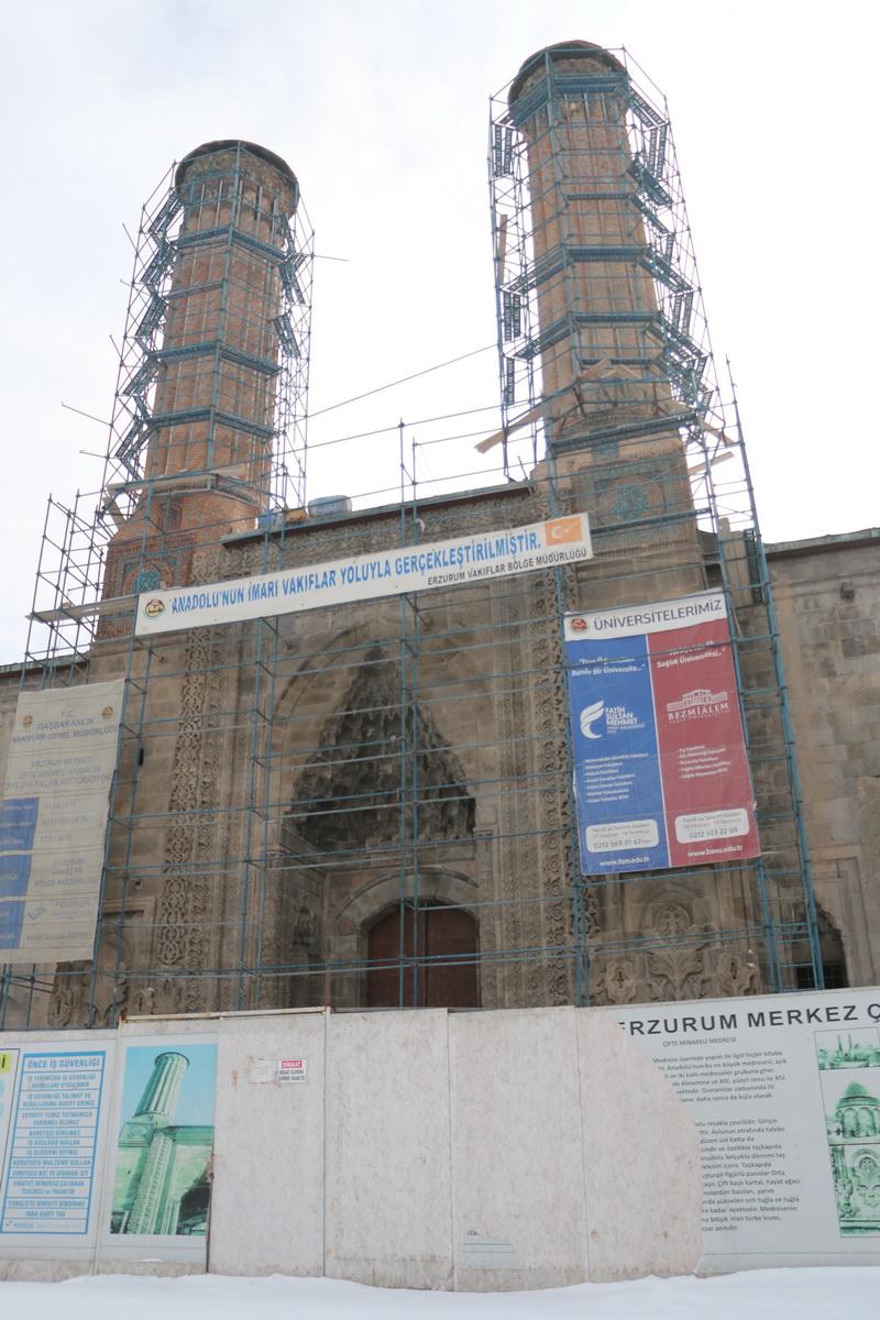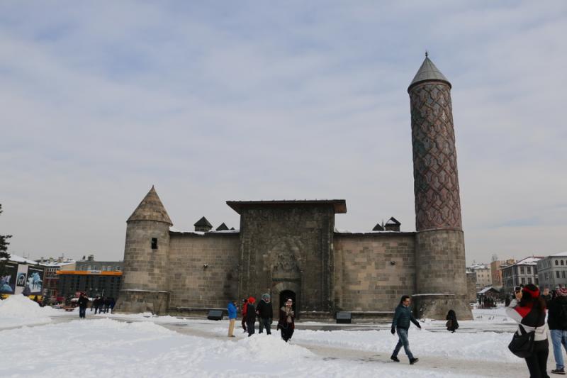 Aziziye Tabyaları sonrası kent merkezine doğru ilerledik. Burada ilk durağımız Hatuniye Medresesiolarak da bilinen Çifte Minareli Medrese. Zamanında Alaeddin Keykubat burayı kızı için yaptırdığı için adı Hatuniye olarak anılıyormuş. Anadolu’nun en büyük açık avlulu medresesi olduğu söyleniyor. Minarelerindeki turkuaz rengi çini işlemeleri oldukça dikkat çekici. Medrese tadilatta olduğu için biz içerisini gezemedik.