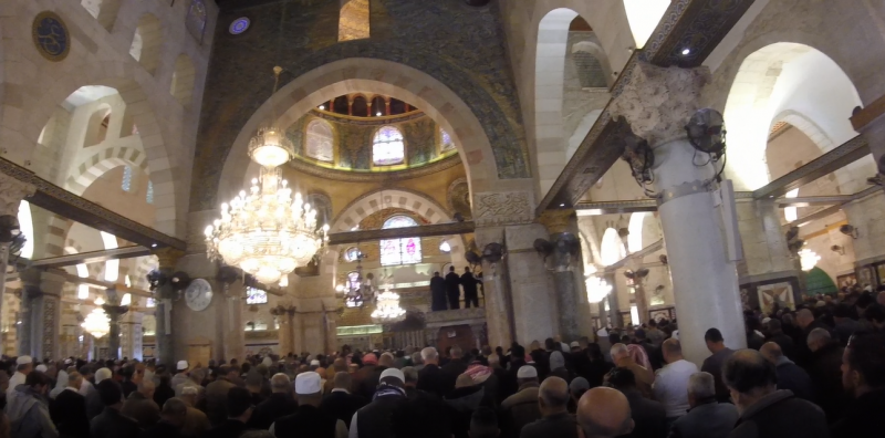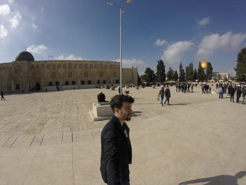 Cuma namazı sırasında Filistinli bir genç ayağa kalkarak "Cihad" falan diye bağırmaya başladı ve kısa süreli herkesin korkmasını sağladı. ama sonradan anladık ki dışarıda Filistinli bir grubun gösterisi varmış ve Filistinliler dışarıda İsrail'i protesto ediyormuş. Türkiye'deki medyadan sürekli İsrail'deki olaylar verilmesine rağmen bu 6 günlük gezim boyunca gördüğüm ilk ve tek olay oldu. Sonrasında ise Kubbet-üs Sahra'ya yürüdüm zaten arası yaklaşık 150 metre, sadece Kubbet-üs Sahra'nın kotu 2 metre civarı daha yukarıda yer alıyordu. Kubbet-üs Sahra'ya o gün giremedim çünkü tam o vakitte içeride sadece kadınlar yer alıyorlardı, sebebi kadınların da cumayı orada kılması olabilir. Aşağıdaki fotoğrafta sağ tarafta sarı kubbeli Kubbet-üs Sahra, solda ise Mescid-i Aksa bulunuyor.