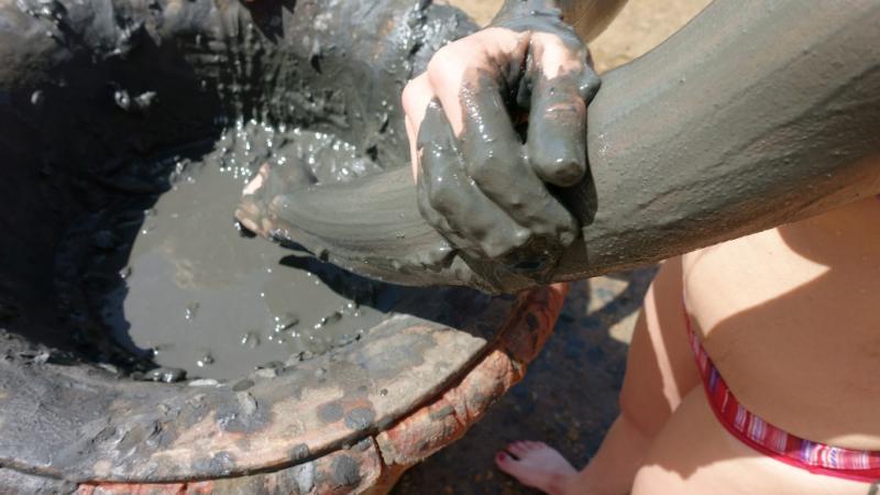 Önce büyük kâseler içinde yer alan, mineralli kili -ki buna “Ölü Deniz minerali” ya da “Ölü Deniz kili” diyorlar – tüm vücudunuza sürüyorsunuz.