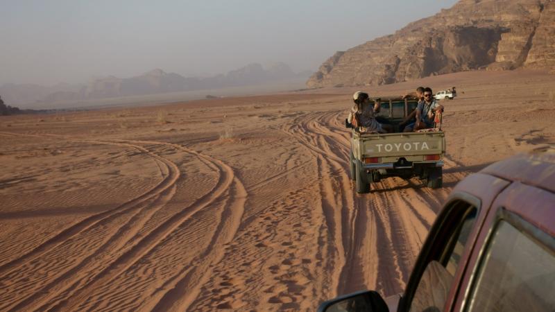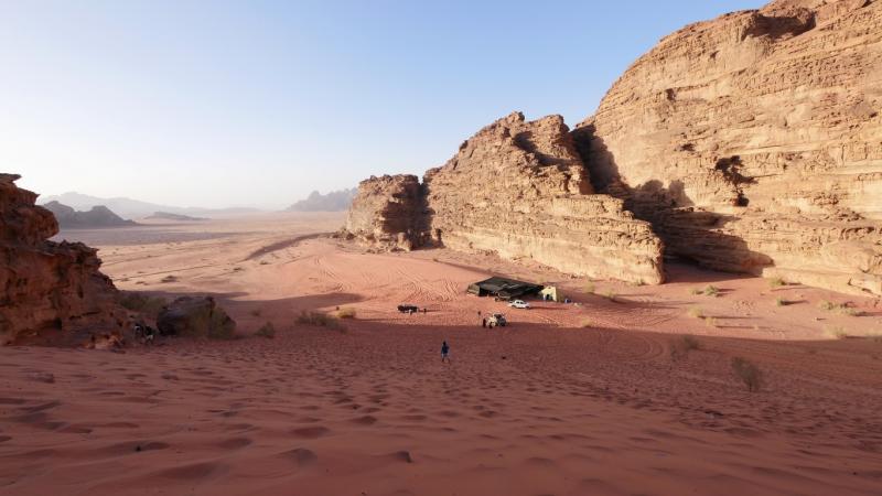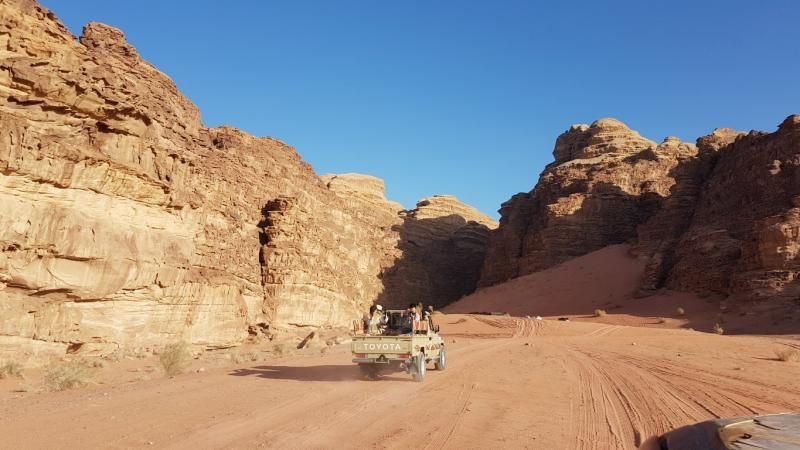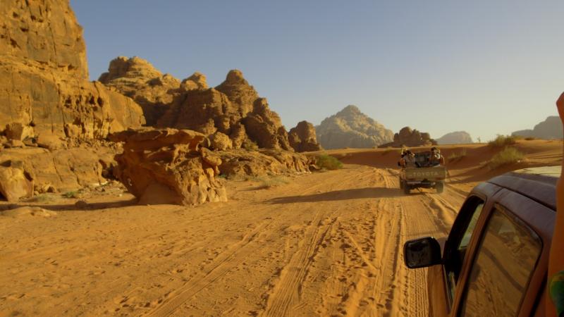 Girişten sonra Wadi Rum içinde safari yapacağımız ciplere bindik. Her cip, arkadaki kasasına yaklaşık 6 kişi alıyor. Tabii çölde giderken çekim yapmak zor. Bej, turuncu, kırmızı renkli dik kayaların arasından hoplaya zıplaya geçtikten sonra kamp alanına geldik. Burası öğle yemeği yiyeceğimiz yer.