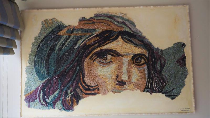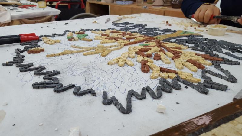 Burada öğrendiğim şeylerden biri ise farklı bir yapım tekniği olduğu. Genelde mozaik yapılırken ana resim üzerine bir file geriliyor. Bu file üzerine de kesilen mermer ya da traverten taşlar kesilerek yerleştiriliyor. Meğerse bu yeni yöntemmiş. Bunun bir de antik, eski yöntemi varmış. O da bir kumaş parçası üzerine yapılacak motifi çizmek ve çizilen motif üzerine direkt kesilen taşları yerleştirmek şeklinde. Bu tarz yapım tekniğini de ilk kez burada görmüş oldum.
