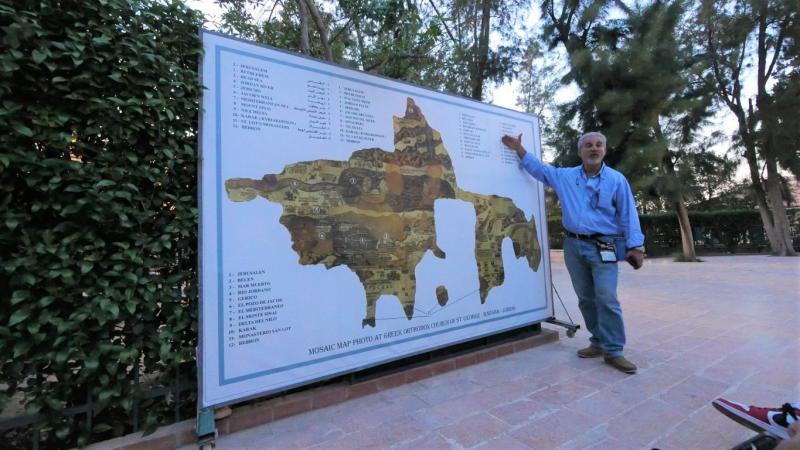 İçeride haritayı görebilme süremiz oldukça sınırlı. Kısa bir süre için halıyı kaldırıyor ve tören sonrası hemen örtüyorlar. Bu nedenle haritayı detaylıca anlamak için hemen kilisenin bahçesinde yer alan haritanın kopyasının asılı olduğu panonun önüne geçiyoruz. Rehberimiz burada bize enteresan bilgiler veriyor.
