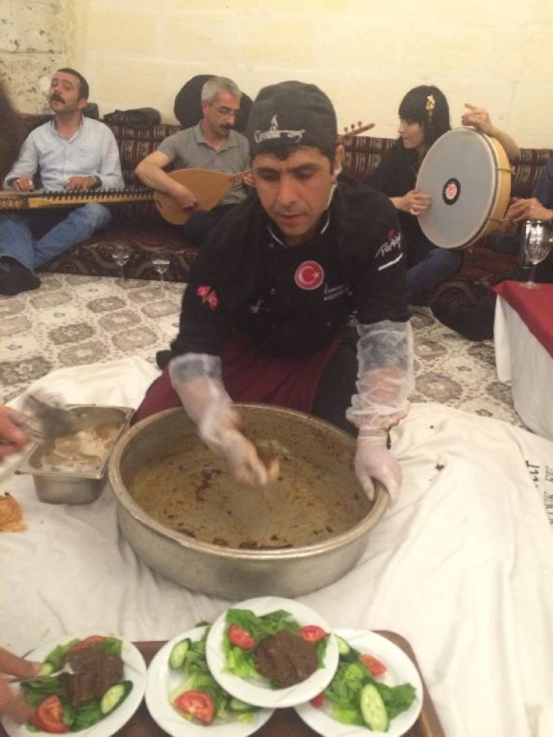 Sıra gecelerinde ikramın bol tutulması da gelenek ve görenekler arasında. Gerçekten de çorba ile başlayan yemek, yöresel tatlar ve kebapla devam edip tatlıyla son buluyor, tabii bir bölünde bir usta gelip tüm malzemeleri gözünüzün önünde katıştırıp yoğurup ikram ediyor. Çiğ köfte severim ama ne yalan söyleyeyim çok da başarılı bulmadım. Neden derseniz çiğ kıyma ile yapıldığından elin sıcaklığı ile pişer, bu arada da bulgur da yumuşar diye bilirim. Bizim köfte içindeki bulgurlar biraz sert kalmış. Bir de acı seven biri olarak benim için fazla sorun olmadı ama herkes çok acı sevmeyebilir, pul biber ve isot miktarını az tutup yanında ikram etseler sanırım daha iyi olacak.