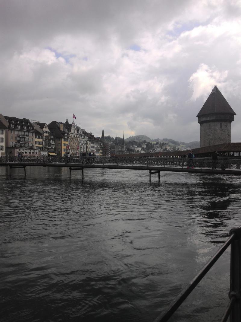 Biraz ileride meşhur Kapellbrücke göründü. Bu köprü üstü kapalı ve sadece yayaların kullandığı, içinde genellikle Hristiyanlıkla ilgili resimlerin olduğu ve turistlerin akın akın geçtiği bir köprü. 14. yüzyılda yapılan Luzern’in sembolü ahşap köprü, Avrupa’daki en eskilerden biri. Reuss Nehri’ni bildiğimiz köprüler gibi düz değil, çapraz olarak geçiyor. Yanındaki Wasserturm (Su Kulesi) ile birlikte zamanında şehrin surlarının bir parçası olarak yapılmış. Çiçekli süslemeleriyle ünlü köprü ve eskiden arşiv, hazine, hapishane olarak hizmet veren kule, turistlerin en çok fotoğrafladığı yerlerden biri. Herkes geçer de biz geçemez miyiz diyerek nehrin karşı tarafına geçtik.