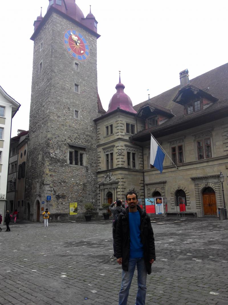 Ordan sola dönerek Rathausquai boyunca otel ve kafe olarak kullanılan tarihi binaların önünden geçtik. Reuss Nehri’nin kuzeyi (Kuzey neresi yahu, pusulayla mı geziyoruz diyenler için: Gölü arkanıza alınca, nehrin sağ tarafı) eski şehir.). Rathaustegg köprüsünün olduğu yerden sağa dönerek Kornmakt meydanındaki tarihi saat kulesine geldik. Baktık herkes fotoğraf çekiniyor bizim neyimiz eksik diyerek bizde çekindik.