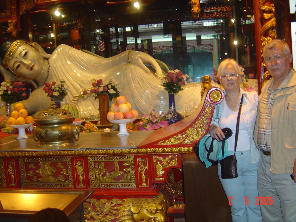 Buradan Yeşim taşlı Buda (Jade Budha) tapınağına gidiyoruz. 1882 senesinde yapılan bu tapınağın içerisinde 2 adet Buda heykeli var. Bunun en önemlisi tapınağın ikinci katında bulunan beyaz yeşim taşından yapılmış olan oturan Buda. 1,9 metre yüksekliğinde ve 1,5 ton ağırlığında olan bu heykele dar merdivenlerden çıkarak ulaşıyoruz. Ancak burada çekim yapmak yasak. Duvarlardaki ahşap oymalar çok etkileyici.