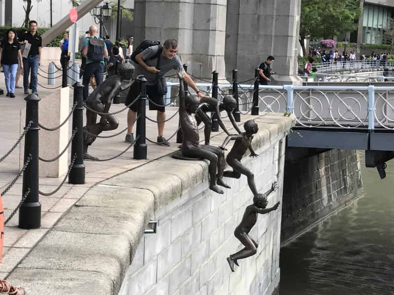 - Şehrin kalbinin attığı yer turistlerin akın ettiği Merlion Meydanı (Merlion Square). Meydanda şehrin simgesi Merlion Heykeli elbette çok önemli ama karşımızda inanılmaz heybeti ile duran, mimari harikası Gemi Otel (Marina by Sands) bizi çok heyecanlandırıyor. Devamında bir kısmını görebildiğimiz Gardens by the Bay, onun devamında meşhur dönme dolap Singapore Flyer ve daha yakınımızda görünen bölgenin meşhur bitkisi Durian'a benzeyen Tiyatro Binası dikkatimizi çekiyor. Bu güzel kombini topluca panoramik olarak sonrasında da tek tek çok sayıda fotoğraflıyoruz. Burada uzun süre kalıyoruz çünkü gecesinin de en az gündüzü kadar güzel olduğundan eminiz.