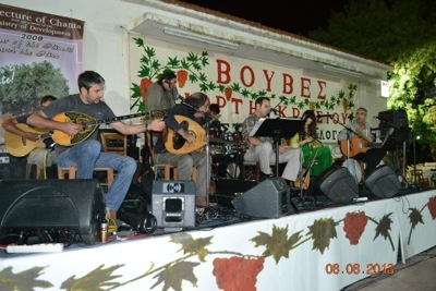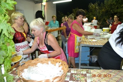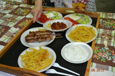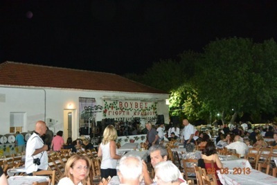 Meydanda masalar sandalyeler dizilmiş, bir sahne kurulmuş, minik bir orkestra yerini almış, yemek kokuları ise her yanı sarmış. 2 büyük mangal yakılmış, birkaç delikanlı şiş kebap (souvlaki), köy tavuğu, sosisleri kızartmakta, köy hanımları ise süper organize bir şekilde Grek salatası, cacık (tzatziki), dolmaları (dolmades) ve kızarmış patatesleri süratle tabaklara koyup servis ediyorlar.