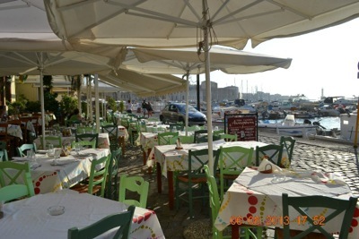 Güneş batmak üzere, daha önceden gözümüze kestirdiğimiz ve günbatımının tam karşısında deniz kenarındaki bir barda içkilerimizi yudumlarken denizin içinde ve kale ile fener arasından kaybolan muhteşem bir günbatımı izliyoruz. (Santorini de umduğum bu manzara idi, ancak sokakta, kalabalıkta ve ayakta izlemek bana pek de cazip gelmemişti). Otelden aldığımız bilgi ile kalabalıktan uzakta sadece birkaç restoranın bulunduğu daha sakin ama yine deniz kenarı güzel bir restoranda çok lezzetli ve deniz mahsüllerinden oluşan güzel bir yemek yiyoruz.