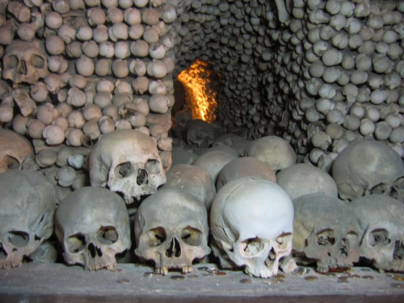 16. yüzyılda mezarlık daraltılmak isteniyor; ancak bu mezarlığa gömülmek isteyenlerin sayısı o kadar fazla ki. Ne yapalım diye düşünürlerken eski mezarlıklar açıyorlar. Çıkarılan kemikleri önce kilisenin bahçesine, daha sonra da yarı kör bir Sisteryan keşişi tarafından kilisenin içine yığıyorlar. Keşiş kemikleri piramit biçiminde yığarak, yaşam sırasında ölümü hatırlatarak insanlara ders vermeye çalışıyor.