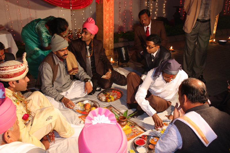Önce damat geliyor. Damat gelince yere serdikleri beyaz bir örtünün üstüne oturuyor. Bir din adamı, damat ve iki kişi daha ayine benzer bir şey yapıyorlar. Sanırım evliliklerinin iyi gitmesi için yapılan bir gelenek. Bir taraftan şarkılar söyleyip, bir taraftan da damadın sürekli açık olan eline birşeyler koyuyorlar. Pandit ise damadın kendisine sunduğu pirinç, çiçek gibi çeşitli malzemeleri de kutsuyor.
