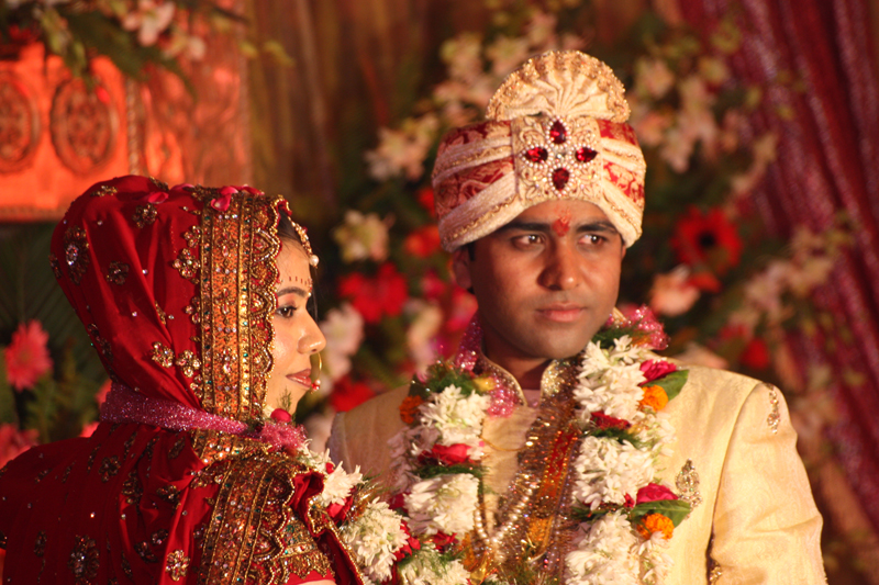 Daha sonra evlilik töreni başlıyor. Herkesin görebileceği bir sahnede bekleyen damadın yanına gelin de geliyor. Gelin tamamen kırmızılar içinde. Kolları dirseğine kadar kınalar içerisinde. Gelin ve damat birbirlerinin boynuna çiçeklerden yapılmış çelenkleri de asınca tören tamamlanıyor. Herkes sıra ile gelin ve damadı tebrik etmeye başlıyor. Sonrasında bol fotoğraf çekimi ve eğlenceye geçiliyor.
