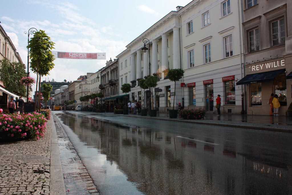 Nowy Swiat caddesi bir noktada – o nokta bir dörtyolda ki trafik ışıkları – Krakowiskie Przedmiescie caddesine bağlanıyor ki bu caddenin sonunda da Rynak yani eski kent merkezi var.
