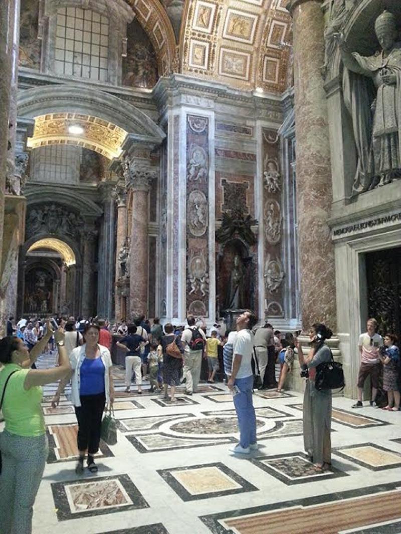Kalabalığı tarif etmeye kelimeler yetmiyor… Eh! Sonuçta burası da Hristiyanların hac yeri… Biz içeri girebilmek için 45 dakika bekledik. Söylendiğine göre o gün Papa, yazlık sarayında olduğu için çok kalabalık değilmiş. Vatikan’da olduğu zamanlar nasıl olur bilmem artık…