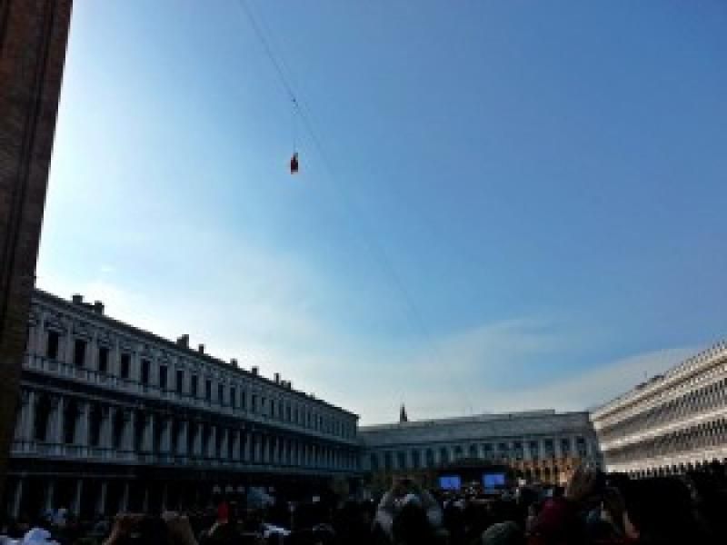 Bu geleneği başlatan ise, cengaver bir Türk akrobatmış. Çan Kulesi'nden Dükler Sarayı'na gerilen bir iple, hiçbir koruyucu malzeme olmadan yürümüş ve Venedik Dükü'ne kendini göstermiş. Bu yüzden önceleri gösterinin adı Türk'ün Uçuşu imiş.