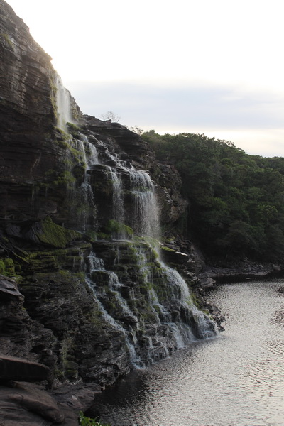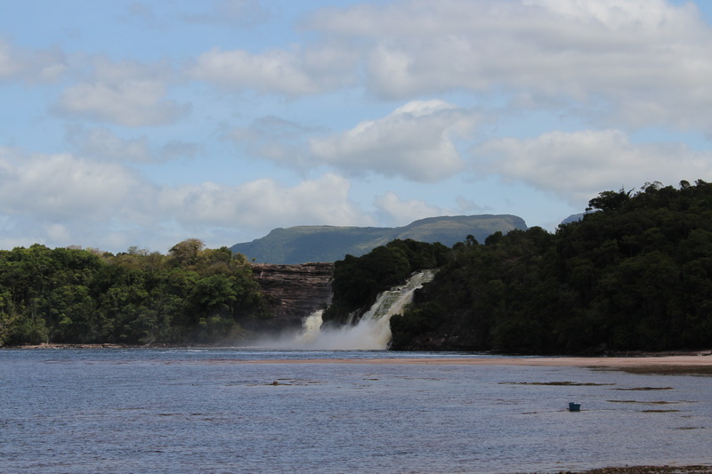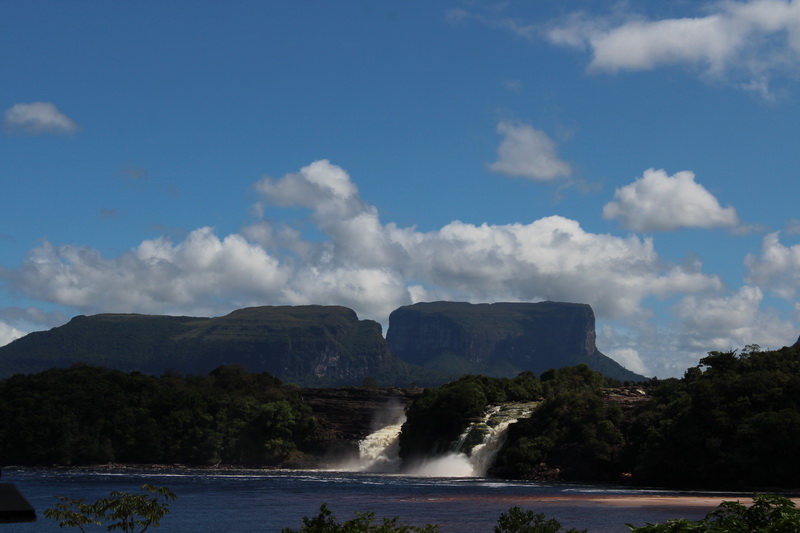 Biz turumuza geri dönersek, curiaralara bindiğimiz nokta zaten otelin önündeki sahil. Ve buradan müthiş bir manzara var. Canaima lagününü besleyen şelaleler tam karşımızda.