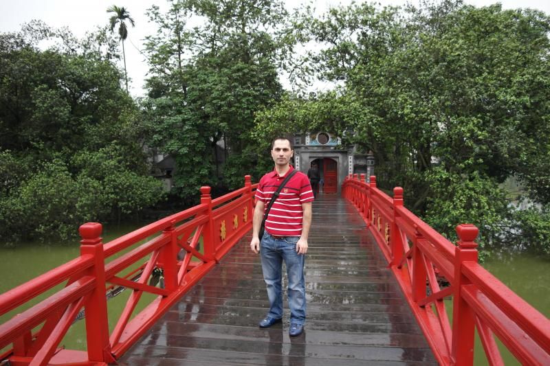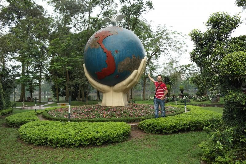 İlk olarak Hoan Kiem Gölü'nün üzerindeki ünlü "The Huc" köprüsüne gittim. Sonrasında köprünün yanında bulunan parkın içindeki barışı simgeleyen dünya anıtına giderek dünyanın üzerindeki Vietnam haritasıyla bir hatıra pozu verdim. O gün hava biraz yağışlıydı ama bu gezmeme ve görmeme engel değildi.
