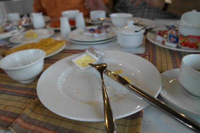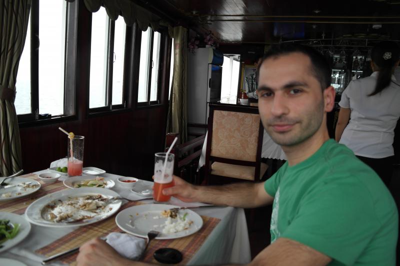 Maymunlar adasından ayrılarak teknemize ulaştık, karnımız da zil çalıyordu daha kahvaltımızı yapmamıştık. Hemen teknemize geçerek biz yokken hazırladıkları kahvaltı masalarımıza geçtik, cam kenarından bir yer kaparak afiyetle Halong Körfezi manzarası eşliğinde güzel bir kahvaltı yaptım.