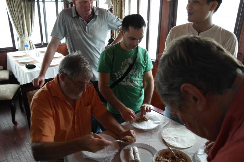 Artık Halong Körfezi turumuzun sonuna geldik. En son olarak kendi ellerimizle Vietnam'ın meşhur Cha Ca rulosunu sardık. Görevli bunun nasıl hazırlandığını ve sonrasında nasıl sarıldığını ayrıntılarıyla anlatarak bize gösterdi. Sonrasında zorlanarak da olsa kendi ellerimle sarmayı başardım, tabii ki sonrasında kendi marifetimi afiyetle de yedim : )