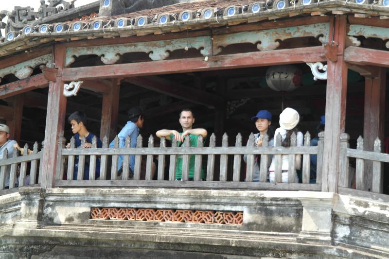 Nihayet sonunda üstü kapalı olan, çok merak ettiğim o meşhur Japon Köprüsü'ne ulaşmıştım. Burada fotoğraf makinemi verip benim pozumu almasını istediğim turist aile Hollandalı çıktı. Nihayet Vietnam'da karşıma el kol hareketleri yapmadan anlaşabileceğim birileri çıkmıştı. Burada çok iyi derecede İngilizce bilseniz bile Vietnamlılarla rahatça anlaşamıyorsunuz.