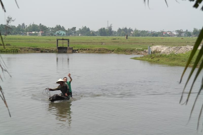 Sıra ağ atarak balık tutmadaydı. Kıyıdan da olsa Vietnamlı balıkçı bayanların yardımıyla birkaç defa ağımı Thu Bon Nehri'ne attım ve Hoi An'daki günübirlik bisiklet turu artı tekne nehir turumun sonuna gelmiştim. Çok güzel bir gündü, o gün pedal çevirerek hem spor yaptım hem de çok güzel bir gün geçirdim.