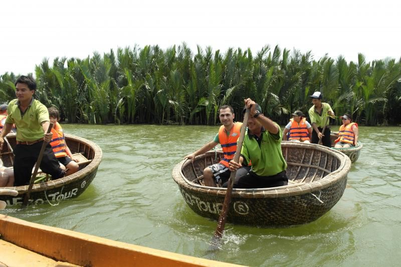 Buradan da bisikletlerimizle ayrılarak Thu Bon Nehri'nin geçtiği başka bir yere geldik. Artık bisikletlerimizi teslim etme zamanıydı ama turumuz daha bitmemişti. Bu sefer de turumuz tekneyle devam edecekti. Thu Bon Nehri'nde, buranın meşhur yuvarlak kayıklarına binmek için nehrin ortasında durduk. Yuvarlak kayıklarla nehirde bitki örtüleri eşliğinde kürek sallayarak ilk defa bindiğim çok farklı bir tekneyi zor da olsa hareket ettirmeyi başardım.