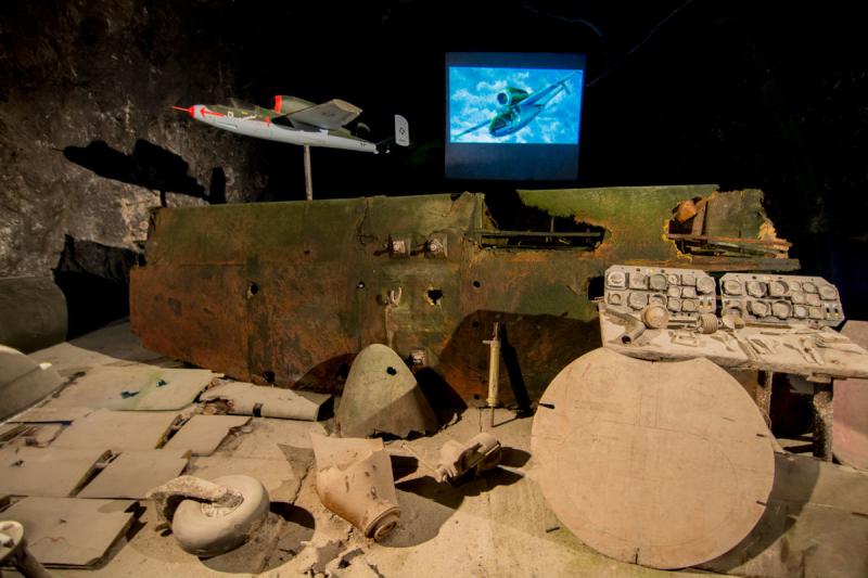 Artık uçakların yapıldığı bölüme diyoruz. Avusturya’nın 1938’de Almanya tarafından işgal edilmesi ile turistik dönem sona ermiş. Naziler, savaştan zarar görmesini istemedikleri birçok şeyi burada saklamışlar. O dönemde öncelik bombardıman ve avcı uçakları. Yerde ise tanklar. Ancak Naziler 1944 yılında cephede kaybetmeye başlayınca bombardıman yapacak ama çok hızlı da olacak bir uçağa ihtiyaçları olduğunu görmüşler. Bu uçakları da işte yerin altında ve gizliliği olan Seegrotte’de yapma kararı almışlar. Bu çerçevede Seegrotte, Heinkel Firması tarafından Nazi ordusuna “kanatlı silah” (savaş uçağı) üretilen ve üretimde de savaş esirlerinin kullanıldığı bir toplama kampı/fabrika haline getirilmiş. Önce içerideki su belli seviyelere kadar boşaltılmış ve kuru, geniş çalışma alanları oluşturulmuş. Burada yaklaşık 2000 esir çalıştırılmış. Bu insanları seçerken öncelikle teknik bilgisi olanları yani elektrik, uçak, motor mühendisleri ve teknisyenlerini seçmişler. Gövde bir yerde, kanatlar bir yerde, kokpit bir yerde, elektrik aksamı bir yerde, motor en aşağıda, günümüzdeki gölün bulunduğu ama o zamanlar kuru olan alanda üretilmiş. Amaç, hepsini dışarıda birleştirmek ve uçakları bir şekilde havalandırmakmış. Seegrotte turu esnasında bu uçağın bir maketini ve bazı orijinal parçalarını görebilirsiniz. O döneme ait jet üretim parçaları bugün titizlikle korunuyor.