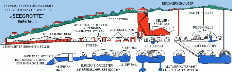Madenin ilginç bir hikâyesi var. Hinterbrühl’den G. Plankenbicher adlı bir değirmenci 1848 yılında 5 metrelik bir kuyu açmak istemiş ancak kuyuyu açarken alçıtaşı öbeği ile karşılaşmış. Yetkililere haber verince burada çok zengin alçıtaşı olduğu tespit edilerek bir maden açılmış. 1912 yılına kadar burası bölgenin önemli alçıtaşı madenlerinden biri olarak işletilmiş. 80 kadar madenci çalışıyormuş. Maden derinleştirildikçe farkında olmadan su kaynağına da yakınlaşmışlar. Derken bir gün alt katta su patlaması olmuş. Alt kat, 20 milyon metre küp kadar suyla dolmuş. Yerin 79 metre altında çalışmakta olan madencilerin çoğu boğularak ölmüş. O günün koşullarında tahliye sistemi kurmak oldukça pahalı olduğundan alçı üretimi durdurularak maden kapatılmış. Uzun yıllar kendi haline terk edilen madenin en alt katı zamanla koca bir yeraltı gölü olmuş. Atıl durumdaki madeni, Viyanalı bir fabrikatör olan Friedrich Fischer satın almış. Fischer’nın ilk planı burayı bir eğlence mekânı yapmakmış. 1932 yılında eski bir duba ve elektrikli bir tekne ile yeraltı gölünün gezilmesine başlanmış. 1938 yılına gelindiğinde yıllık 50.000 kişi ziyaretçi rakamına ulaşılmış.