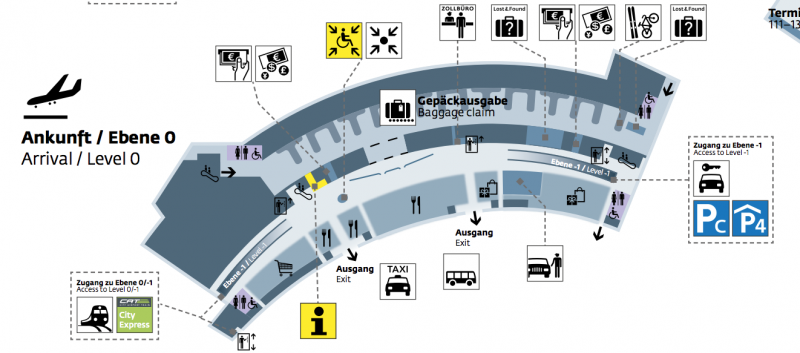 Umarim biraz da olsa sizin isinize yaracak bilgiler vermisimdir. Yukarida anlatmaya calistigim tüm biletleri gelmeden önce online olarak da satin alabilirsiniz, bu olanak da mevcut ama bence gerek kalmayacaktir. Son olarak bir noktayi da hatirlatiyim, havaalanina ya da havaalaninda sehire toplu tasima araci yani S7 banliyo treni ile gelecekseniz, elinizdeki mevcut biletlere, hangisi olursa olsun, bir tek seferlik 2,20 EUR bileti almak zorundasiniz. Bunun sebebi de havaalanin merkez denen bölgenin hemen biraz disinda olmasi ve o yüzden ek bilet gerekecegi. Havaalaninda indikten sonra bavul sonrasi cikista sag tarafta information yazan, asagidaki planda sari i ile gösterilen yerden de tüm bu biletlerinizi rahatlikla satin alabilirsiniz.