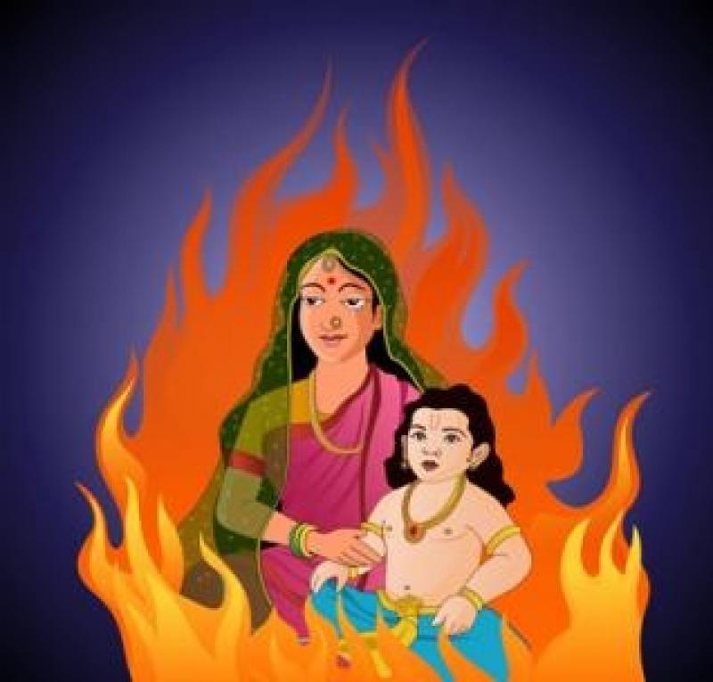 Bir efsaneye göre Holi kelimesinin şeytan kral Hiranyakashipu'nun kötü ruhlu kardeşi Holika'nın isminden geldiği söylenir. Hiranyakashipu Tanrı olduğunu iddia etmektedir ve herkesin ona ibadet etmesini istemektedir. Fakat öz oğlu Prahlada buna karşı çıkar. Prahlada Tanrı Vishnu’nun adanmışlarındandır ve ona ibadet etmektedir. Hiranyakashipu oğlunu türlü zalimliklerle cezalandırmak ister fakat bunların hiçbiri Prahlada’yı etkilemez, o yine doğru bildiği yoldadır. Sonunda Holika (Prahlada’nın şeytan halası) onu kendisiyle birlikte ateşin üzerine oturmak için kandırır. Holika onun ateşte yanmasını engelleyecek bir pelerin giyer fakat Prahlada’nın bundan haberi yoktur. Ateş gürlemeye başladığında pelerin Holika’dan kayar ve Prahlada’yı örter, Holika yanar ve Prahlada sağ kalır. Vishnu belirir ve Hiranyakashipu’yu öldürür. İyiliğin kötülüğü yenmesinin sembolü olarak bu şenlik ateşi yakılarak Holi kutlanır.