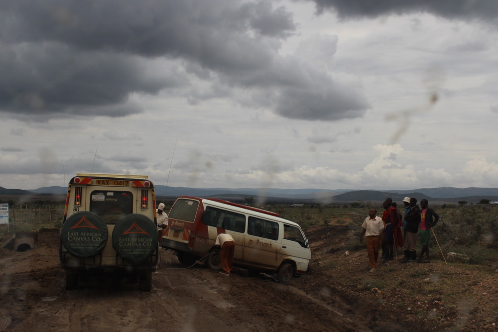 Nairobi’ye devam ederken yol üzerinde çamura saplanıp kalmış iki araç görüyoruz. Şehirlerarası minibüsçülük yapan ve Pullman’s denilen bu araçları kendi aracımıza halatla bağlayıp yola geri döndürmeye çalıştık. Tabii bununla birebir bizim aracın şoförleri ilgilenirken biz de buradaki yerli halkla kaynaşma fırsatı bulduk.